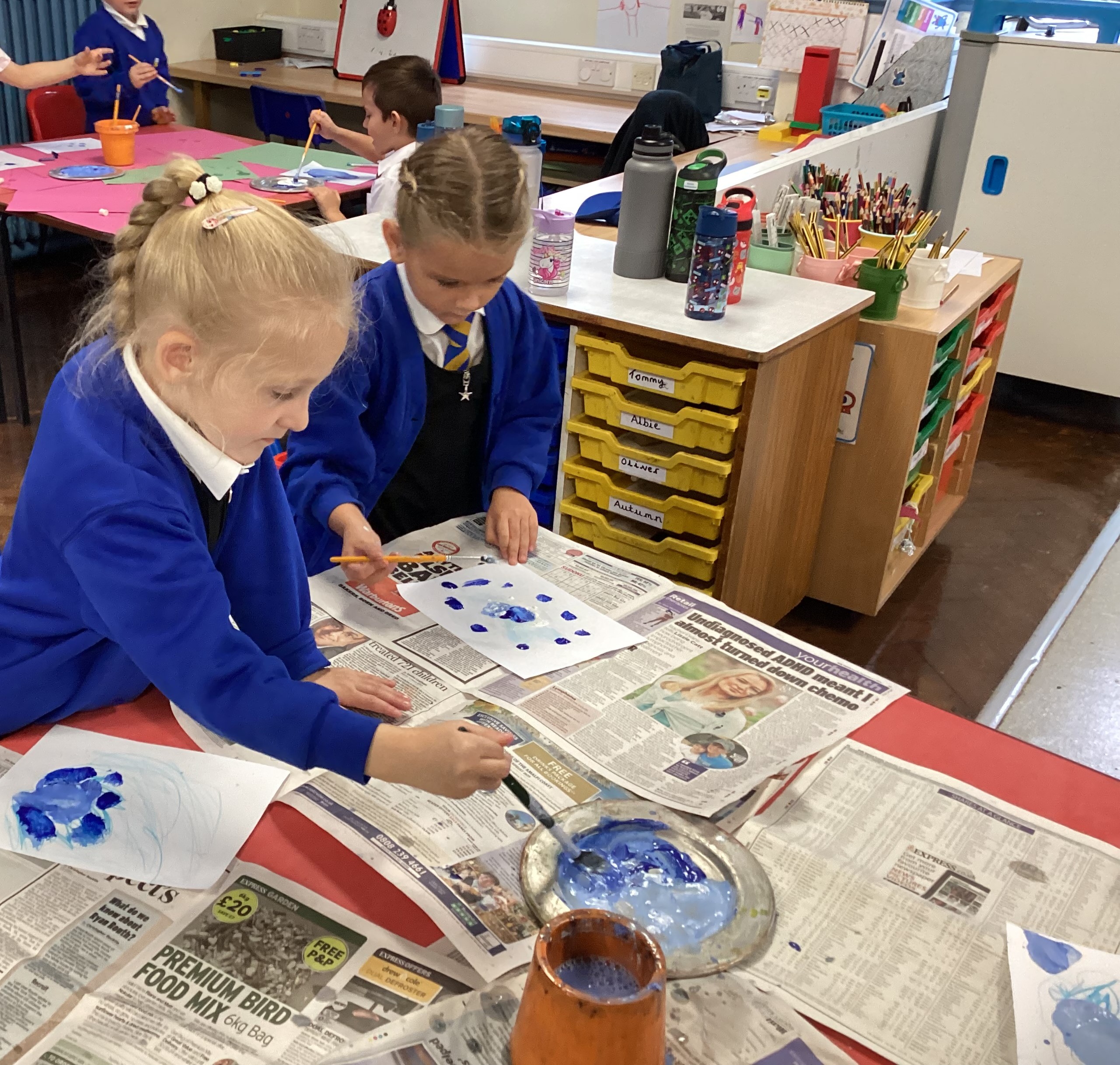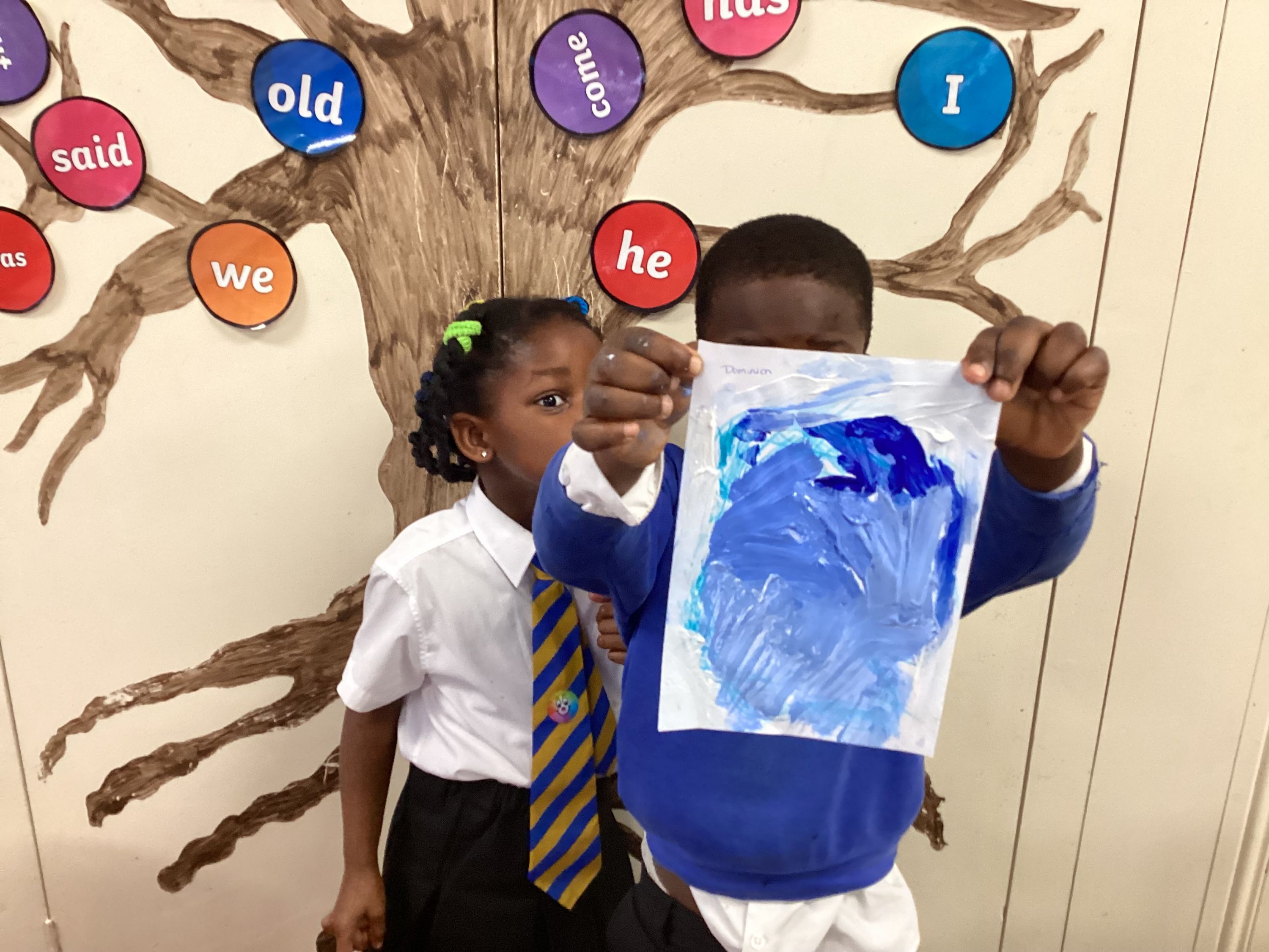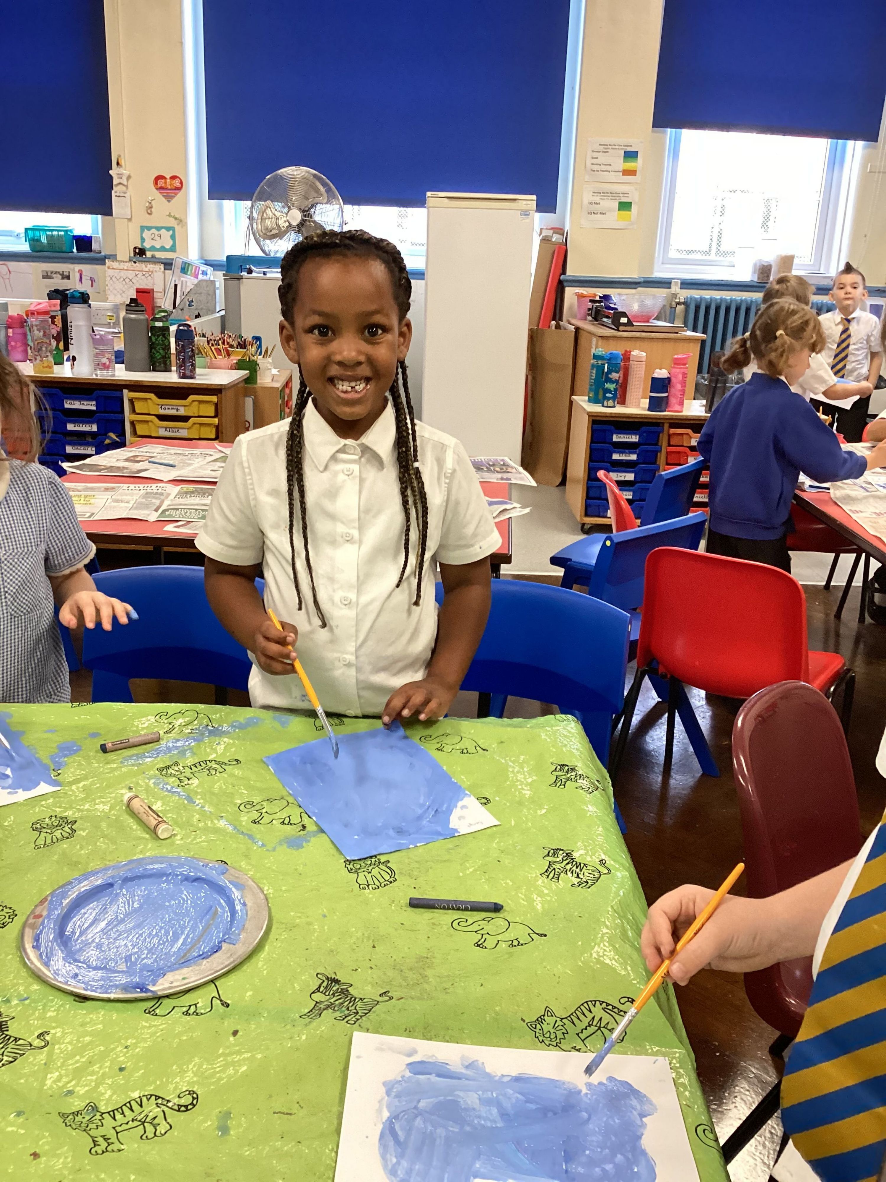 We continued to practise our use of tints and shades. This week we created a splash effect by using wax crayons to draw a splash and then painting over it with different shades of blue.