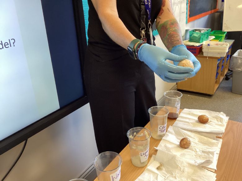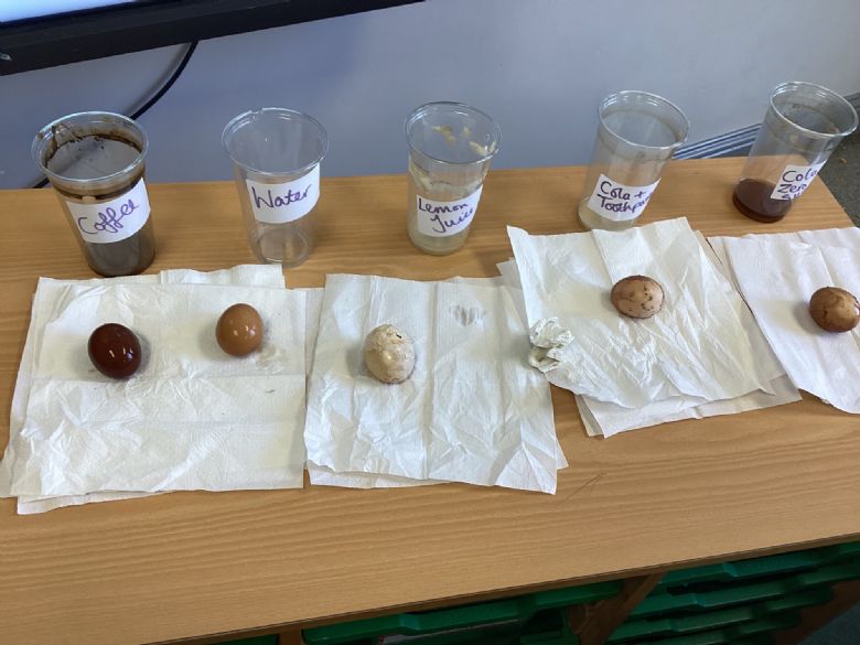 In science, Penguins were looking at the results of their investigation about the effects on enamel from different foods. They put eggs in different liquids and left them for a week. The results were shocking and it helped Penguins to understand the importance of brushing their teeth with toothpaste.